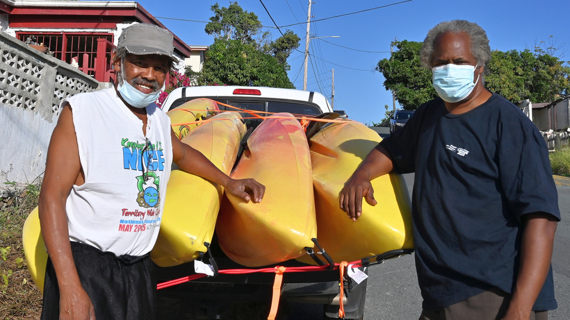 Justin pauses for a picture with ClimateChangeVI.org director, Karl Callwood, who trucked the Kayaks from Yacht Haven to Mandahl.